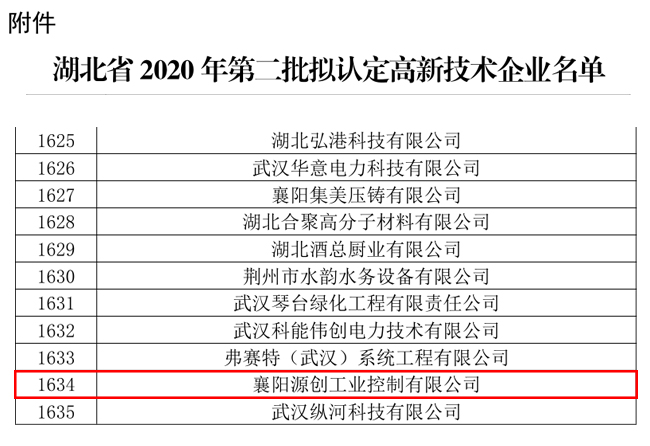 近日,科技部火炬中心公布了2020年湖北省第二批擬認(rèn)定國家級高新技術(shù)企業(yè)名單,共2199家企業(yè)通過了國家高新技術(shù)企業(yè)的認(rèn)定,其中襄陽源創(chuàng)工業(yè)控制有限公司榜上有名。