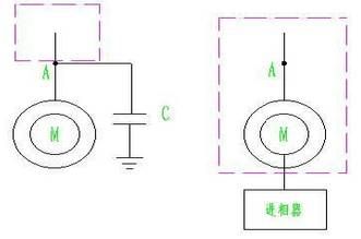 電容并聯(lián)在電機(jī)的前端,其補(bǔ)償范圍是在補(bǔ)償點(diǎn)的前端,沒有覆蓋后端的電機(jī);進(jìn)相器串聯(lián)在電機(jī)的后端,其補(bǔ)償范圍擴(kuò)大到了電機(jī)。各自的補(bǔ)償范圍如各自的回路圖中虛線框所示。