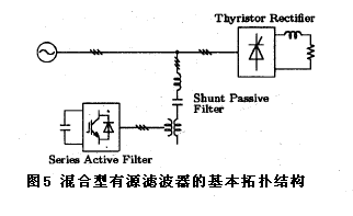 圖5所示為混合型濾波器,它是有源濾波器和無源濾波器的組合結(jié)構(gòu)。這種濾波器結(jié)構(gòu)目前非常普遍,因為它并聯(lián)的LC無源濾波器部分消除了大量的低次諧波,因而有源濾波器部分容量可以做到很小(負荷容量的5%左右),這樣大大減少了有源濾波器的體積和成本。它可以同時消除電壓和電流諧波,而且成本相對來說較低,因而非常受歡迎。但是這種結(jié)構(gòu)的濾波器的缺點在于只能針對特定負荷進行補償,負荷運行狀況變化較大的時候補償性能不好。