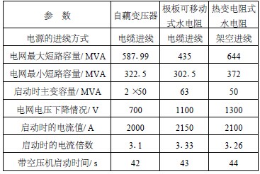 根據(jù)目前實(shí)際采集到的啟動(dòng)曲線情況來(lái)看, 這3 種啟動(dòng)方式都無(wú)特別明顯的優(yōu)勢(shì)和特別大的區(qū)別, 3 種不同的啟動(dòng)方式將電網(wǎng)的壓降值都控制在電網(wǎng)允許的范圍內(nèi), 啟動(dòng)電流的倍數(shù)都控制在額定電流的3 倍左右, 啟動(dòng)時(shí)間都控制在42~45 秒內(nèi)。由于各地現(xiàn)場(chǎng)的情況不完全一致, 實(shí)際運(yùn)行情況肯定受其他啟動(dòng)因素的影響, 所以認(rèn)為這3 種啟動(dòng)方式都是大型電機(jī)比較理想的啟動(dòng)方式, 其對(duì)電網(wǎng)產(chǎn)生的壓降大小除了和當(dāng)?shù)仉娋W(wǎng)容量有很大關(guān)系外,和其上級(jí)主變壓器的容量也有密不可分的關(guān)系。采取不同的電機(jī)啟動(dòng)方式啟動(dòng)空壓機(jī)時(shí)的技術(shù)參數(shù)比較見表1 。