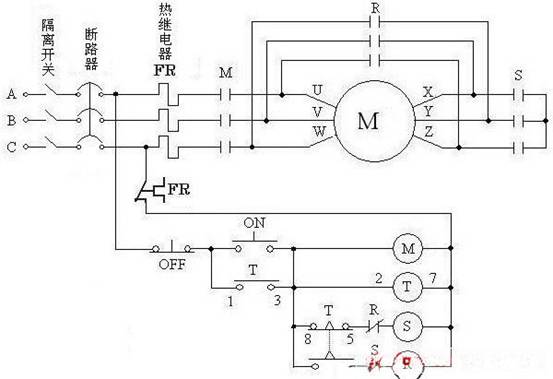 斷路器----按下ON啟動按鈕---M,S,T得電---M接通主回路,S通過T的常閉觸點及R的常閉觸點得電---S主回路接通--正在做起動運轉(zhuǎn)過程。
